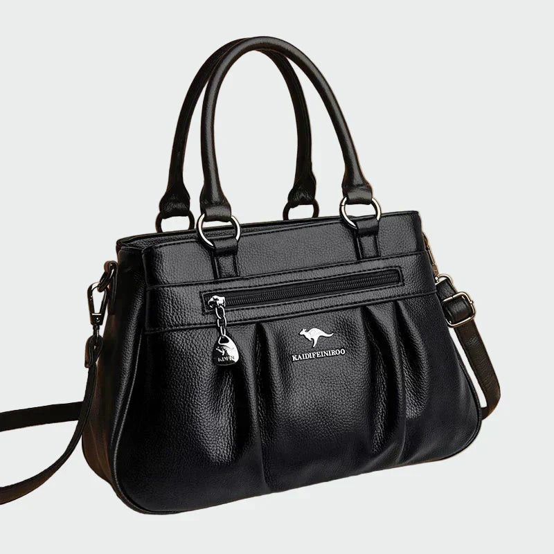 Elegáns fekete női táska, amely vállon és kézben is hordható, prémium minőségű műbőrből készült, finom textúrával. Két erős fogantyúval rendelkezik a kényelmes hordozás érdekében, és levehető vállpántja rugalmas használatot biztosít. A külső cipzár a táska elülső részén funkciót és stílust ad hozzá, míg a fém dekoratív medál fokozza a táska luxusát. Ideális választás az irodába, de mindennapi kirándulásokhoz is tökéletes.