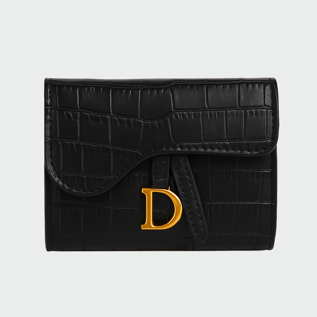 Elegáns fekete pénztárca, amelynek dombornyomott textúrája krokodilbőrre emlékeztet. A modern dizájnt a jellegzetes aranyszínű fémzár egészíti ki, amely luxus és stílus érzetét kelti. Praktikus belső elrendezéssel rendelkezik, amely biztonságos szervezést biztosít kártyák, készpénz és apró tárgyak számára. Olyan kiegészítő, amely ötvözi a kényelmet, a praktikusságot és az eleganciát, ideális bármilyen alkalomra.