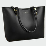 Elegáns női válltáska fekete színben, ideális mindennapi használatra és professzionális megjelenéshez. Magas minőségű öko bőrből készült, amely tartósságot és stílust kínál. Kényelmes belső térrel rendelkezik minden szükséges dolog számára, míg a dupla vállpántok kényelmet biztosítanak a hordozás során. Az arany részletek finom luxusérzetet kölcsönöznek.