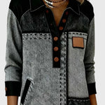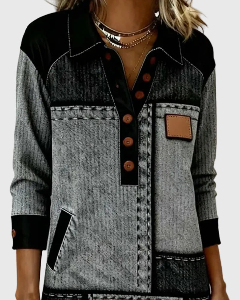 Elegáns részletek: A V-nyak, díszgombok és színes panelek modern, stílusos megjelenést adnak.