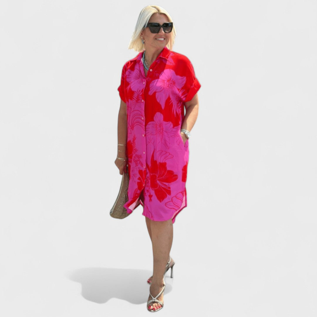 Catrisa - Virágmintás ruha V-nyakú kivágással és zsebekkel