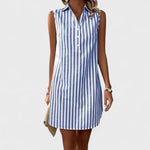 • Klasszikus csíkos – A kék-fehér csíkok meghosszabbítják a sziluettet és időtlen megjelenést kölcsönöznek a ruhának